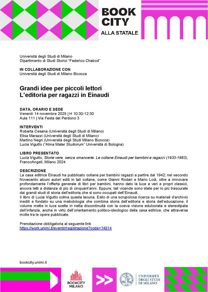 Nell’ambito di BookCity 2025, il Dipartimento di Studi Storici “Federico Chabod”, in collaborazione con l’Università degli Studi di Milano Bicocca, organizza per il 14 novembre un incontro dal titolo “Grandi idee per piccoli lettori. L’editoria per ragazzi in Einaudi”.