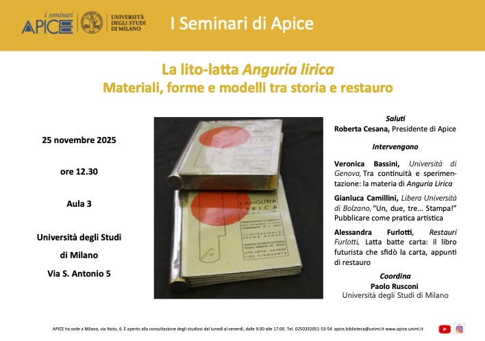 Partecipano alla discussione Gianluca Camillini (Libera Università di Bolzano), grafico e storico del design, i cui studi indagano il rapporto tra avanguardie artistiche, tipografia e comunicazione visiva nel Novecento; Veronica Bassini (Università di Genova), storica dell’arte e della cultura visiva del primo Novecento, si è occupata di arti decorative, illustrazione e cultura materiale del libro a stampa; e Alessandra Furlotti, restauratrice specializzata in materiali moderni e contemporanei, che ha seguito il restauro del volume per il laboratorio di conservazione di APICE. La discussione, introdotta da Roberta Cesana (Università degli Studi di Milano), Presidente di APICE, sarà coordinata da Paolo Rusconi (Università degli Studi di Milano), professore ordinario di Storia dell’arte contemporanea, già Presidente di APICE.