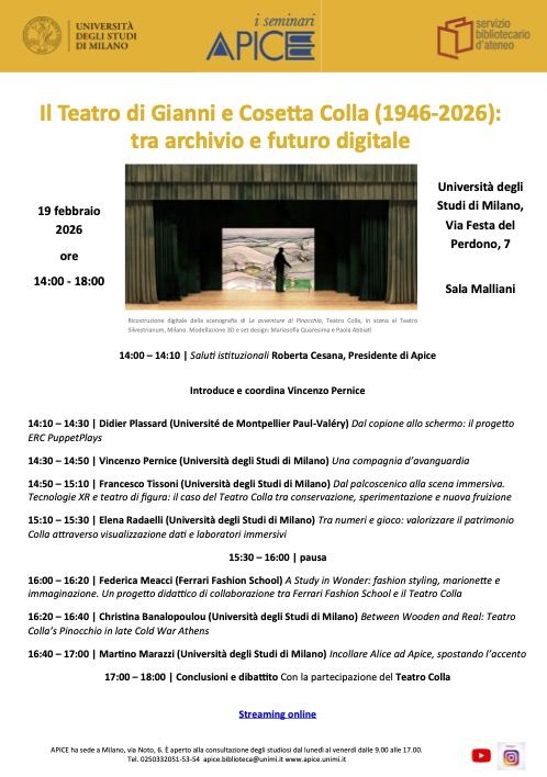 L’evento è aperto a tutta la cittadinanza e alla comunità accademica. Sarà anche online in streaming a questo link https://video.unimi.it/lecturec/il-teatro-di-gianni-e-cosetta-colla-1946-2026-tra-archivio-e-futuro-digitale/