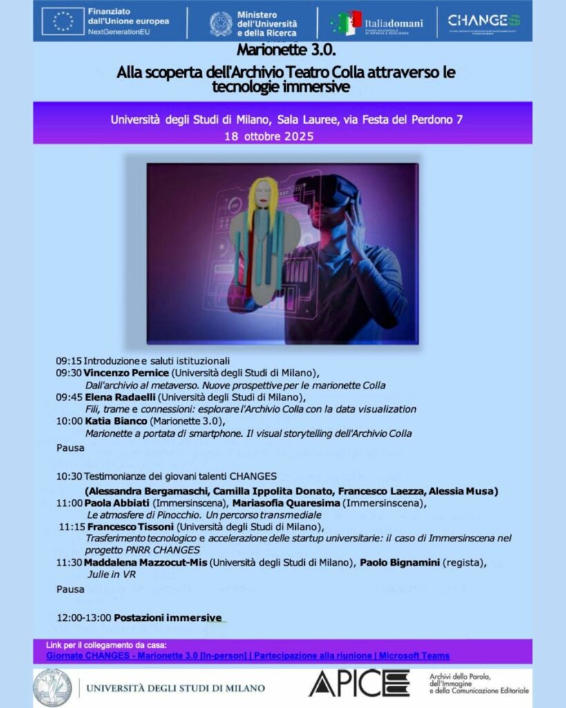 Sabato 18 ottobre l’Archivio Teatro di Gianni e Cosetta Colla, conservato ad Apice, sarà protagonista di un evento all’ Università degli Studi di Milano, in Sala Lauree di via Festa del Perdono, 7. “Marionette 3.0. Alla scoperta dell’Archivio Teatro Colla attraverso le tecnologie immersive” racconterà il progetto di valorizzazione digitale del fondo, prima con alcune presentazioni teoriche frontali, a cura dei ricercatori e collaboratori di Marionette 3.0, poi con un’esperienza in realtà aumentata e virtuale.