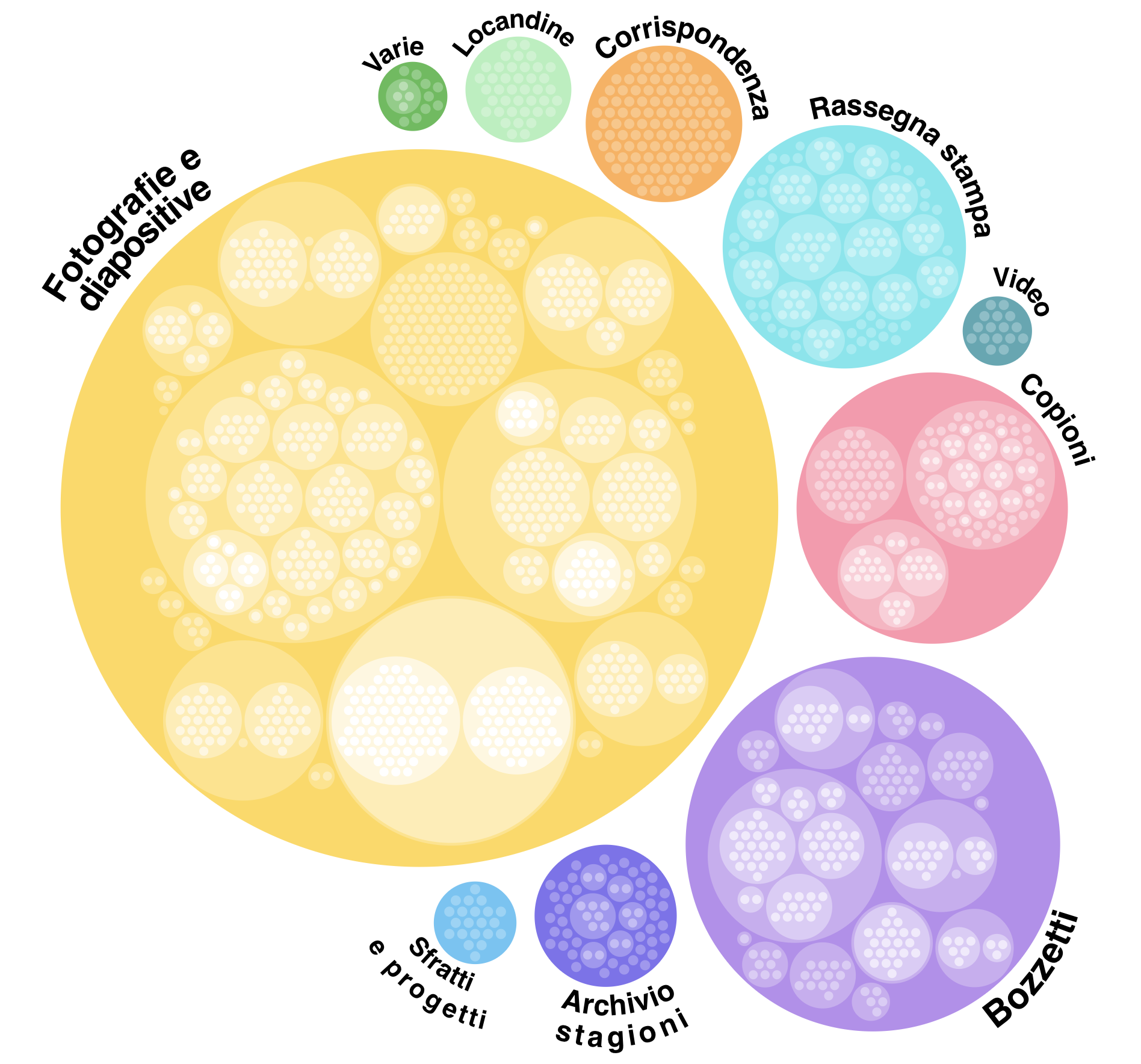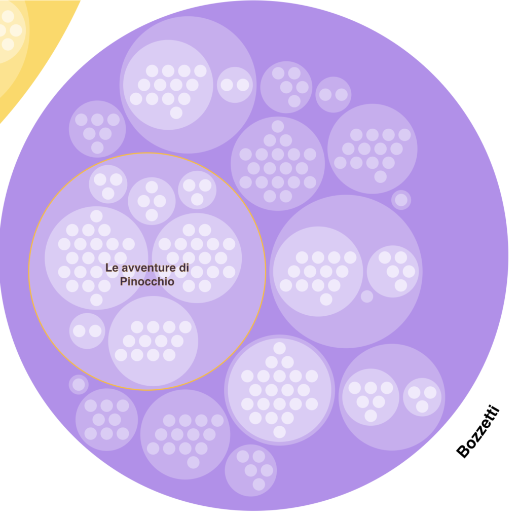 La complessità della struttura gerarchica dell’archivio – dal fondo alle singole unità documentarie, passando per serie e sottoserie – è stata affrontata attraverso una visualizzazione interattiva di tipo zoomable circle packing. In questa rappresentazione l’archivio appare come una composizione di cerchi concentrici, ciascuno con dimensioni proporzionali al numero di documenti che contiene. Cliccando su un cerchio, questo si espande fluidamente rivelando i livelli successivi della gerarchia. È come osservare l’archivio da diverse altitudini: prima una panoramica dall’alto che mostra l’insieme, poi lo zoom progressivo sui dettagli, mantenendo sempre visibile il contesto.