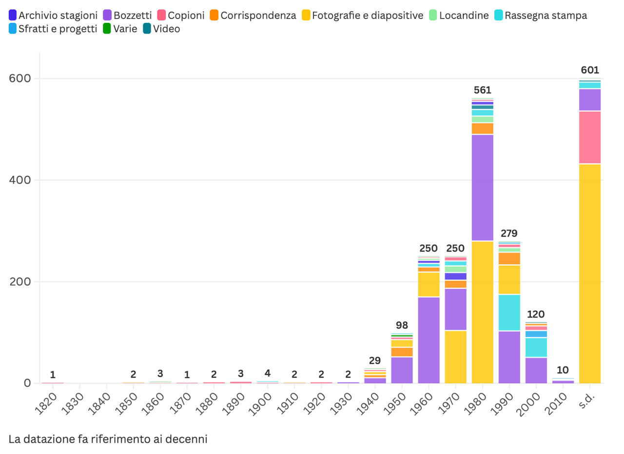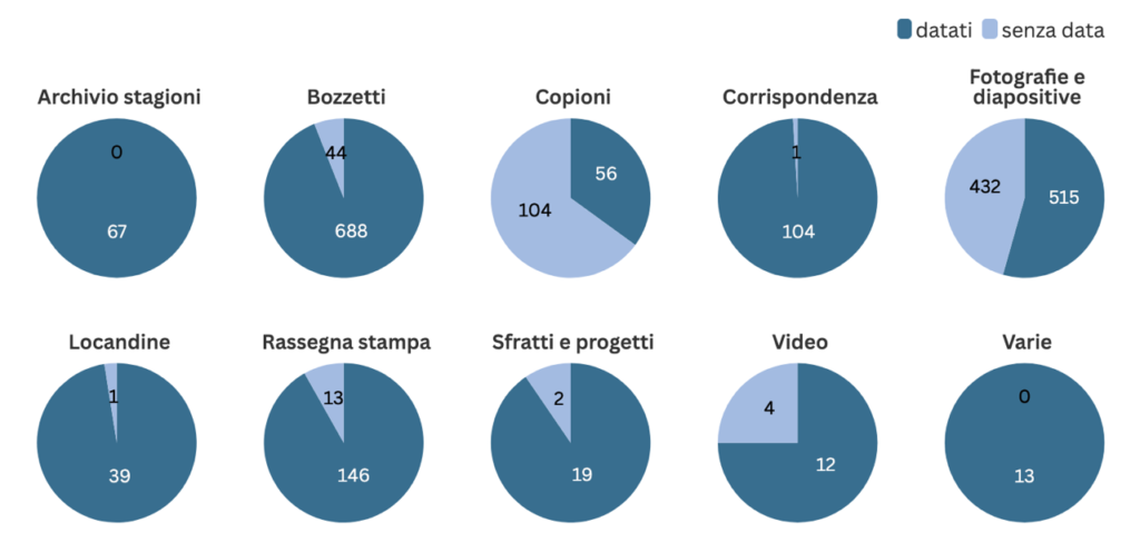 Delle 2260 unità archivistiche totali, 1659 sono datate mentre 601 sono prive di datazione, circa il 27% del totale. Ma il dato aggregato nasconde differenze cruciali tra le serie: fotografie/diapositive e copioni mostrano le lacune più significative. I copioni antichi (1824 – 1929, sottoserie) raramente riportano l’anno di redazione originale. Le fotografie di scena venivano scattate senza annotazione sistematica della data, perché il loro scopo era documentare soluzioni sceniche, non creare un archivio storico. In molti casi, l’assenza di una data esplicita non implica tuttavia una perdita definitiva dell’informazione, che potrebbe essere ricostruita attraverso l’analisi incrociata di metadati, corrispondenze, programmi di sala e contesti produttivi.