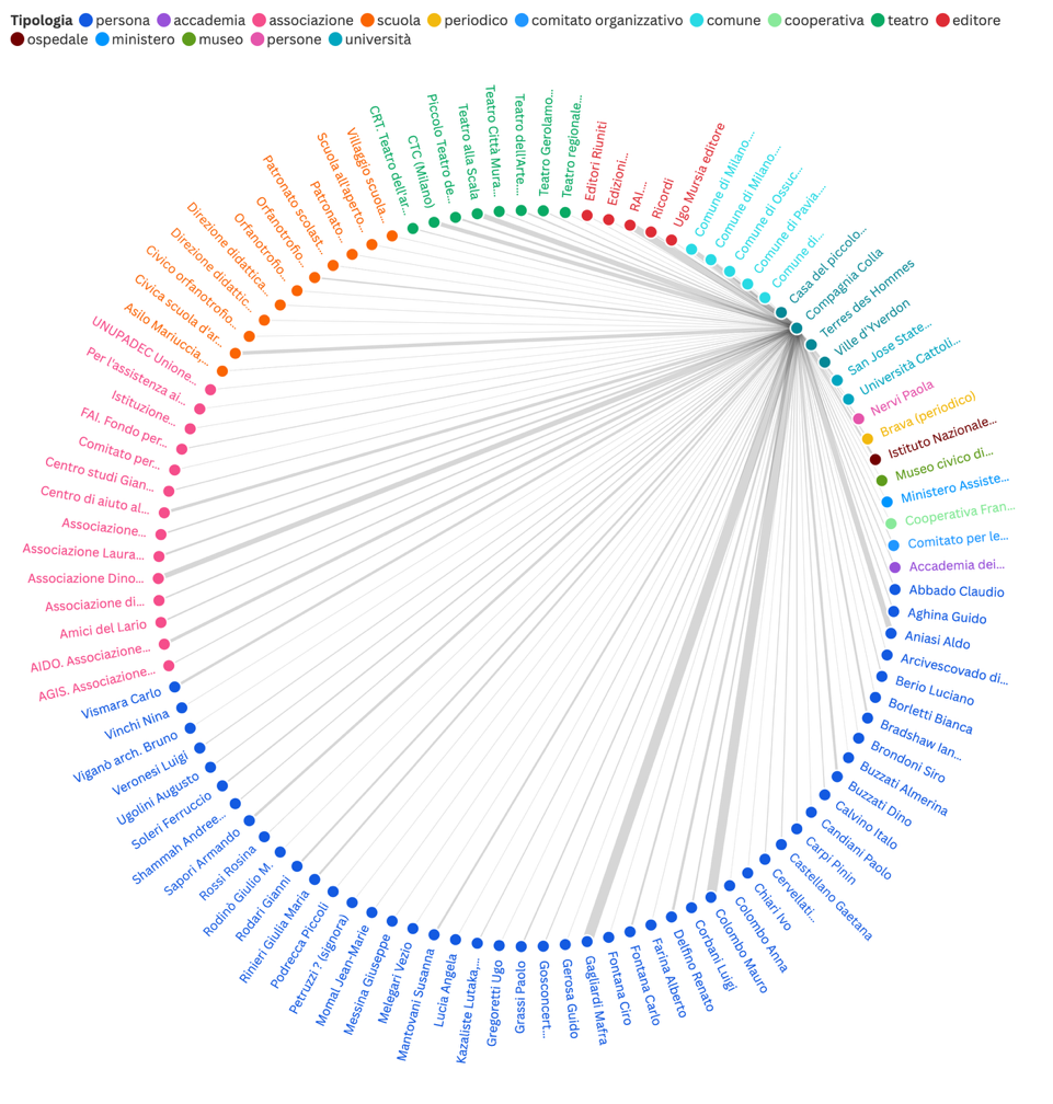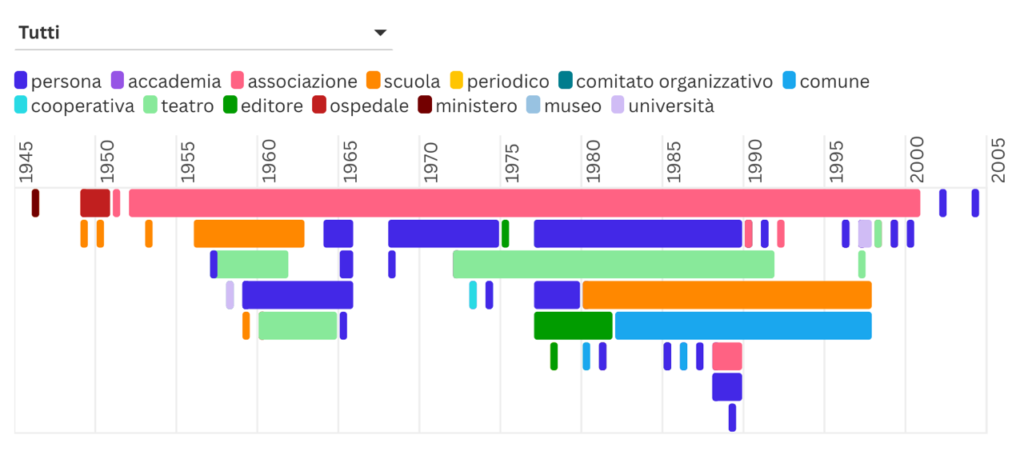 Un archivio teatrale non documenta solo spettacoli, ma reti di relazioni artistiche, collaborazioni creative, scambi intellettuali. Per rendere visibile questa dimensione relazionale è stato creato un network graph interattivo: i nodi rappresentano persone (la Compagnia Colla al centro, poi teatri, scuole, associazioni ecc.), le linee che li collegano rappresentano le collaborazioni documentate dall’archivio, con spessore proporzionale al numero di lettere scambiate. Questa visualizzazione permette scoperte immediate: chi erano i collaboratori più assidui? Quali figure ricorrono in diversi momenti della storia della Compagnia? Complementare al network graph è un Gantt chart che visualizza gli scambi epistolari su una linea del tempo. Ogni riga rappresenta un corrispondente; le barre orizzontali indicano i periodi in cui sono documentate lettere. Così diventa visibile non solo con chi Colla collaborava, ma anche quando e per quanto tempo.