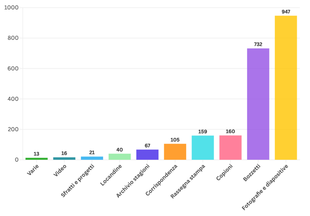 Le visualizzazioni quantitative rivelano aspetti dell’archivio che altrimenti rimarrebbero nascosti. Dalle 2260 unità archivistiche distribuite in 10 serie emerge immediatamente un dato sorprendente: fotografie e bozzetti costituiscono circa il 75% del materiale complessivo, mentre il materiale multimediale è significativamente scarso. Questo dato racconta qualcosa di importante sulla cultura del lavoro della Compagnia Colla e, più in generale, sulla scarsa disponibilità di tecnologie di registrazione video accessibili alle compagnie teatrali fino agli anni recenti.